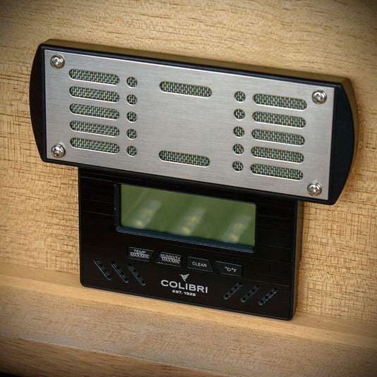 The humidor will hold up to 45 cigars and comes with two dividers, a humidifier, and a digital hygrometer which can be set to either Farenheit or Celsius.